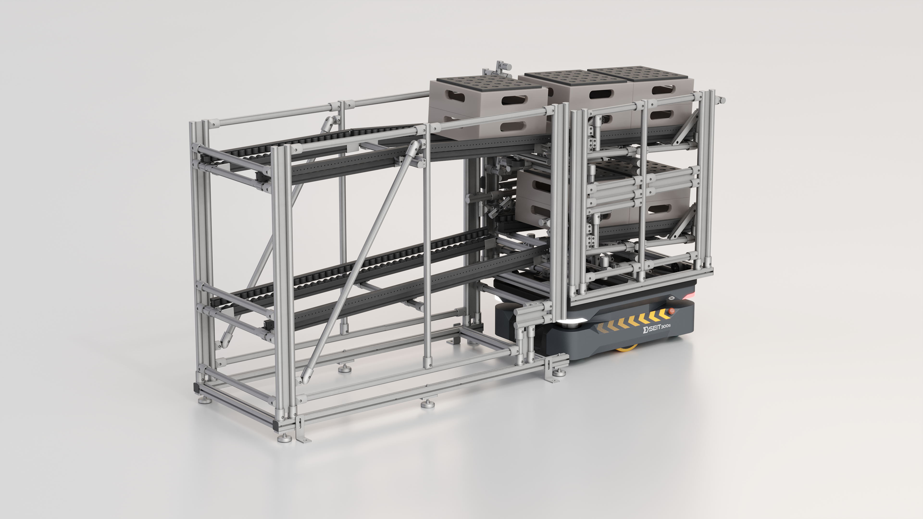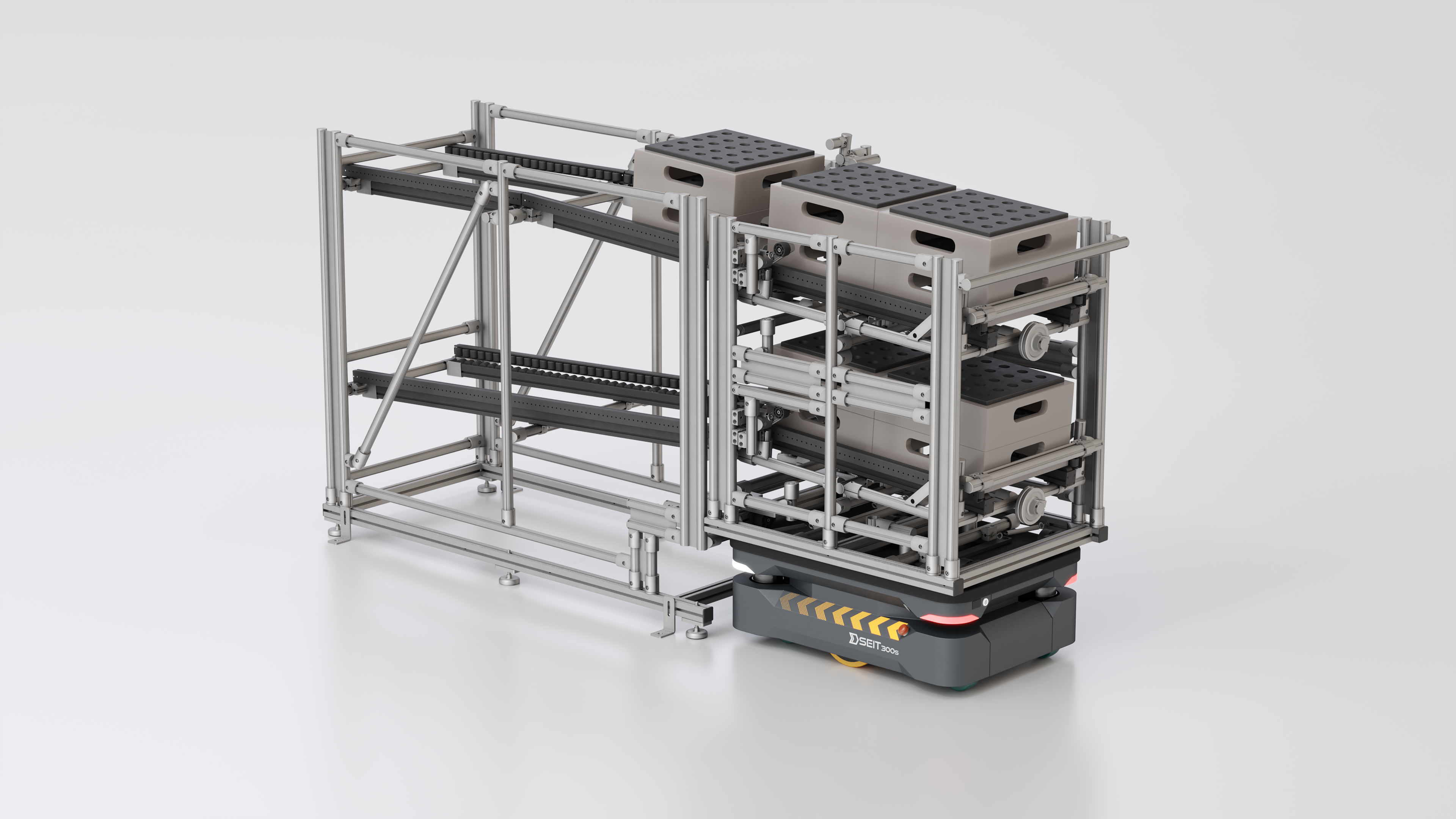 - AMR robot (npr. SEIT-300 z vlečnim priključkom) pripelje voziček s polnimi zabojniki do delovne postaje.